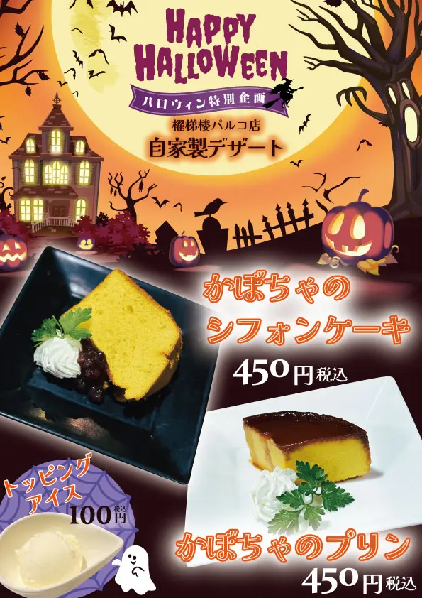 ふわり軽やかなシフォンと、濃厚なプリン。ハロウィンにぴったりの二品をご用意。