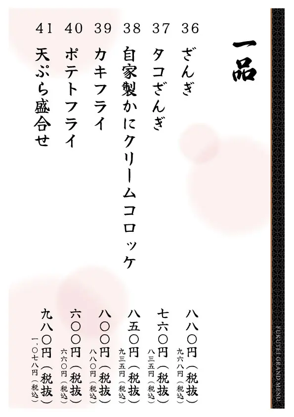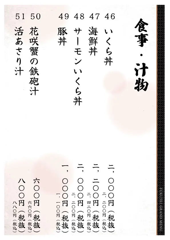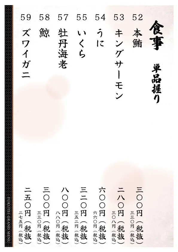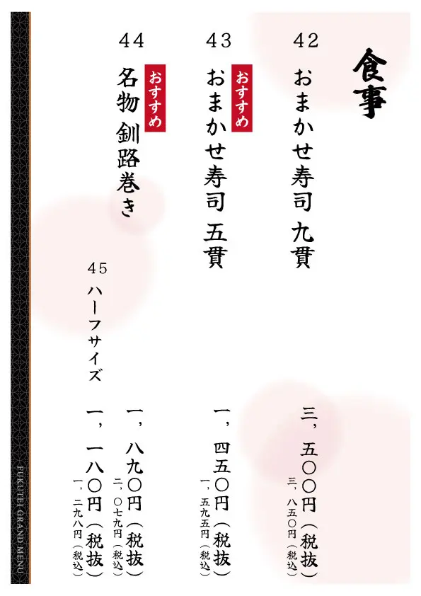 お店の雰囲気は落ち着いた和の空間で、個室も完備されているため、家族や友人との食事にも最適です。メニューにはふく亭名物釧路巻きやその他寿司、刺身、焼き魚、一品料理などがあり、幅広い料理を楽しめます。
