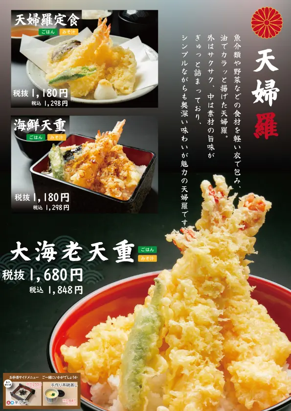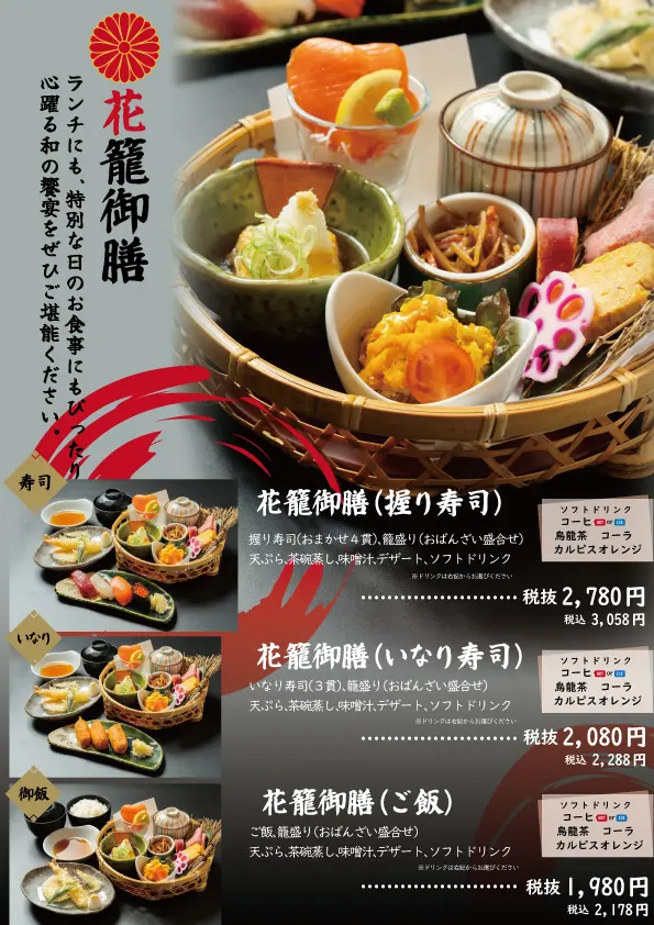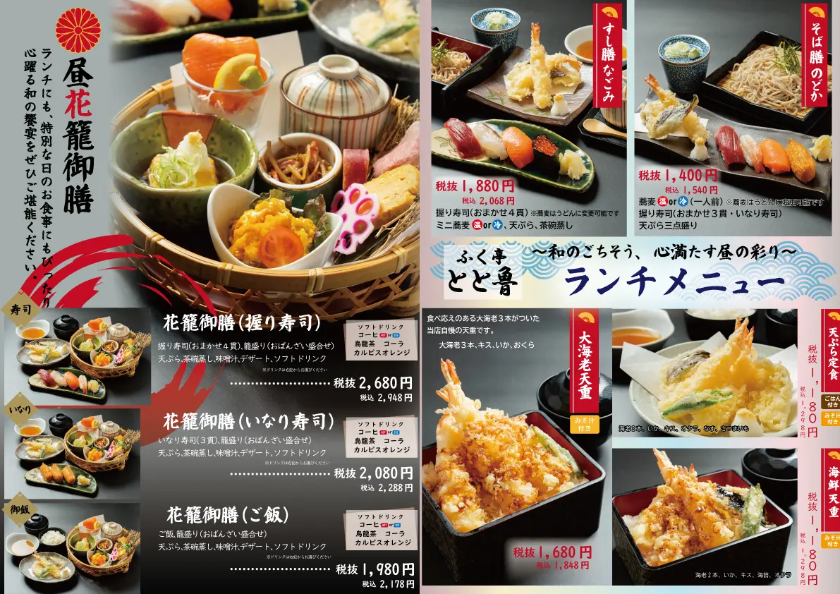 籠膳や焼魚、海鮮、蕎麦、丼ぶりなど、世代を問わず楽しめるランチメニューがラインナップ。夜には、寿司や天ぷらを肴に、地酒とともにゆったりとしたひとときをお過ごしいただけます。お得な「晩酌セット」もご用意しております。
