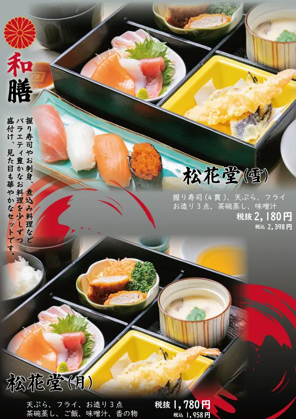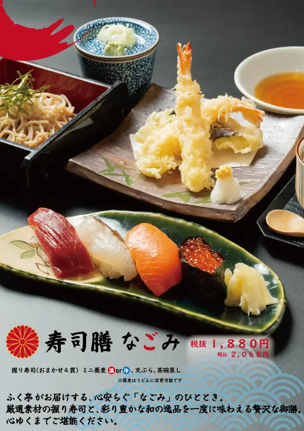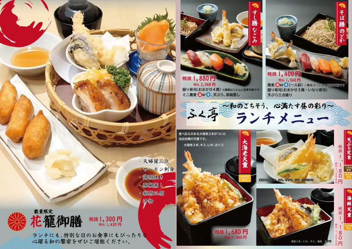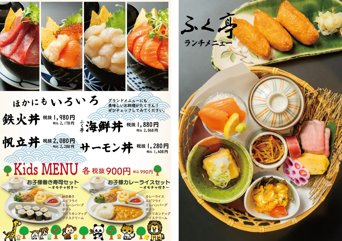 旭川市のイオンモール旭川西1階にある「釧路ふく亭 旭川西店」。四季折々の旬の食材を活かした和食を楽しめます。寿司や天ぷら、焼き魚、蕎麦、丼ぶり定食など、バラエティ豊かなメニューが揃っており、特に新鮮な海の幸を使った海鮮重や和膳が人気です。