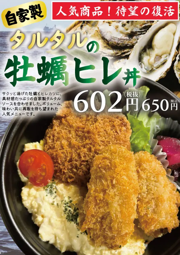 人気商品の復活です!サクッと揚げた牡蠣とヒレカツに、具材感たっぷりのふく亭こだわり自家製タルタルソースを合わせました。ボリューム、味わい共に再販を待ち望まれた人気メニューです。